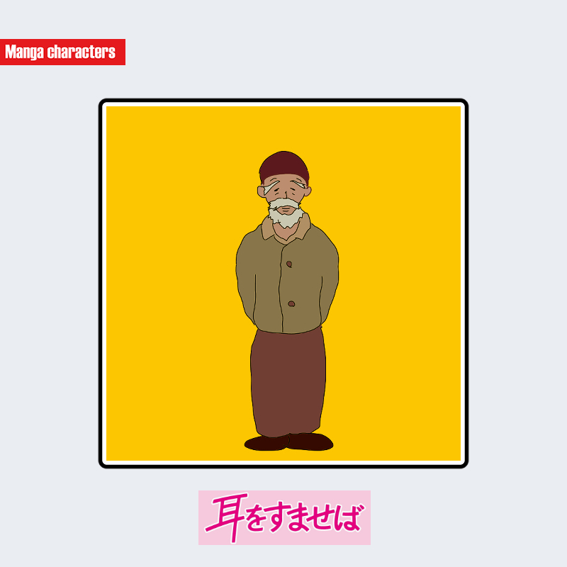 『耳をすませば』に登場する西 司朗(にし しろう)は、短く刈り込んだ白髪交じりの髪型と、はっきりとした口ひげを特徴とする高齢男性として描かれている。上半身はオリーブ系の長袖シャツで、前面にボタンが並ぶシンプルな構造が確認できる。頭には濃赤色の帽子を着用しており、視覚的な上方向のアクセントとなっている。ボトムスは赤茶系のスラックスで、上衣と近い色調でまとめられ、全体の重心が中央に集約された造形を形成している。構造分類としては「日常衣装型」に該当し、他の大人キャラと共通する落ち着いた視覚階層に位置づけられる。