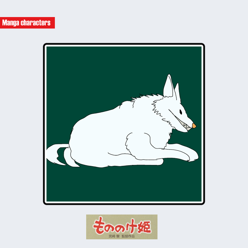 『もののけ姫』に登場するモロの君は、大型の白い狼を基盤とした四足獣の造形を持ち、全身を覆う長い白毛によって柔らかなシルエットを形成している。頭部は細長い口吻と鋭い耳が特徴で、目は細く表現され、狼型の比率を保ちながらも非常に整った輪郭構造となっている。脚は太めで、伏せの姿勢でも前後の脚の長さ・太さの比率が明確に描かれている。尾は長く、先端まで均一にふくらみを持つ。全体として、同作のシシ神の複合造形とは異なり、純粋な獣型フォルムに属する視覚階層が特徴である。