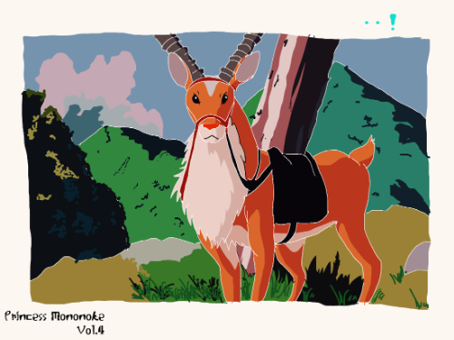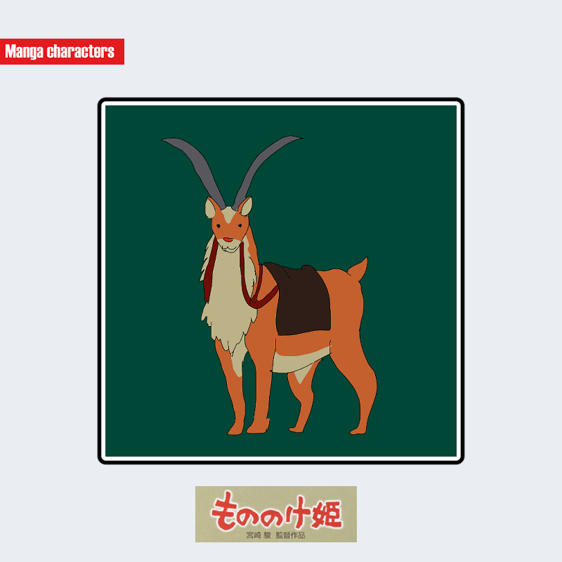 『もののけ姫』に登場するヤックルは、鹿に似た四足獣の体躯を基盤にしつつ、長く湾曲した細身の角と首元の豊かな白毛を備える独自の造形を持つ。胴体は赤茶系の毛色で統一され、脚は細く直線的な比率で描かれる。背には騎乗用の鞍が装着され、革素材を思わせる濃色の布と固定具が視認できる。体型は均整が取れており、他の大型獣(モロの君やシシ神)と異なり、家畜的要素を含んだ「鞍装備系」の視覚階層に位置づけられる。