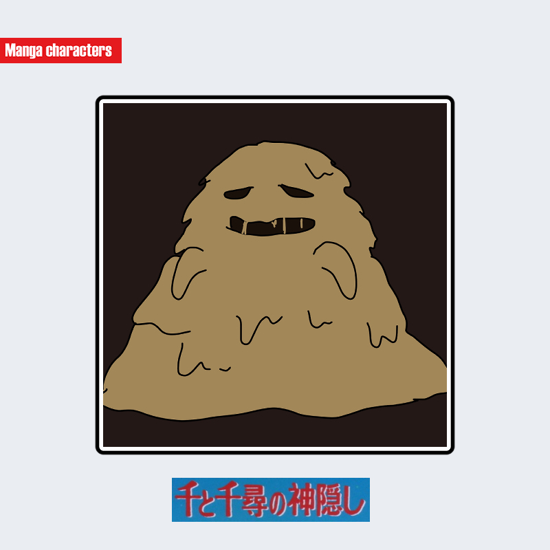 『千と千尋の神隠し』に登場するオクサレ様は、全体が不定形の土塊状に膨らんだ単一塊シルエットを持ち、外周は滑らかな面と垂れ下がる泥状のラインが混在する造形が特徴となる。身体の境界線は曖昧で、腕に相当する部分も最小限の凹凸のみで示されている。頭部も本体から連続した形状として描かれ、目と口の位置のみが暗い色で記号的に区分される。下部は幅広く地面に接し、他キャラに見られる明確な脚部構造は存在しない。