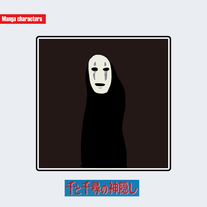 『千と千尋の神隠し』に登場するカオナシは、全身を覆う漆黒の一枚布のような外套シルエットを持ち、腕や脚の輪郭を排した「一体化フォルム」が特徴となる。頭部には楕円形の白い仮面が装着され、目・口・線状の模様が記号的に配置されている。身体の厚みや起伏は最小限に抑えられ、上から下へ向かう滑らかな縦長構造が強調される。他キャラの単一塊型(おしら様など)と異なり、完全な黒外套が輪郭全体を形成する点で独立した階層に属する。