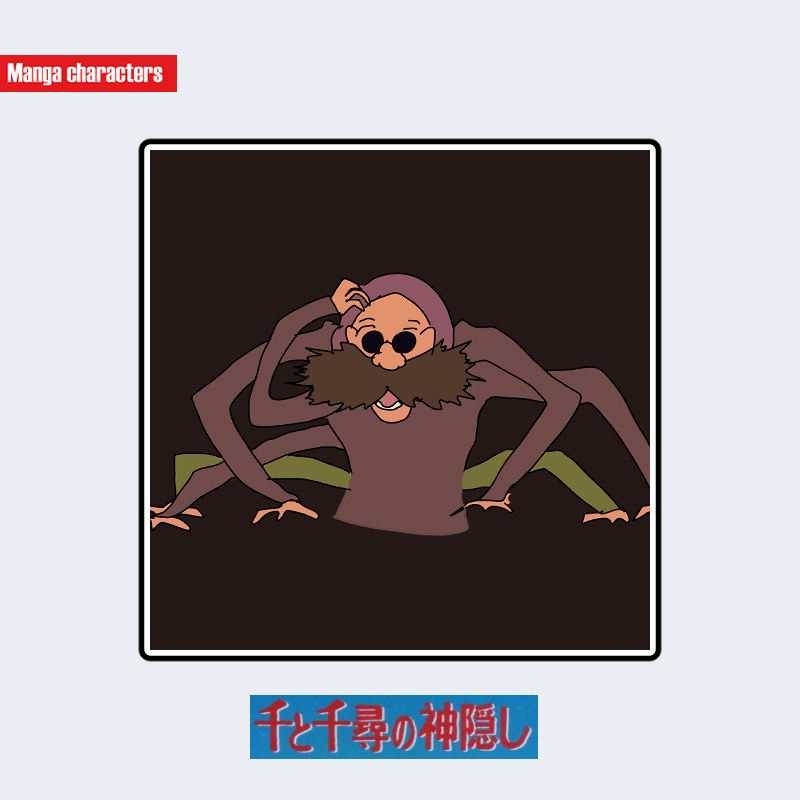 『千と千尋の神隠し』に登場する釜爺(かまじい)は、細長い人型上半身と、多数の蜘蛛脚状の補助肢を下部に備えた複合造形が特徴となる。上半身は薄紫系の長袖上衣を着用し、頭部には同系色の帽子(布状のキャップ)が確認できる。口元には大きく広がる濃色のひげがあり、顔面の大部分を覆う造形パーツとして視覚的存在感が強い。補助肢は6本以上が確認でき、人間型と多肢構造が混在する「複合体型」の視覚階層に分類される。他キャラの純獣型・単一塊型とは明確に異なる階層を持つ。