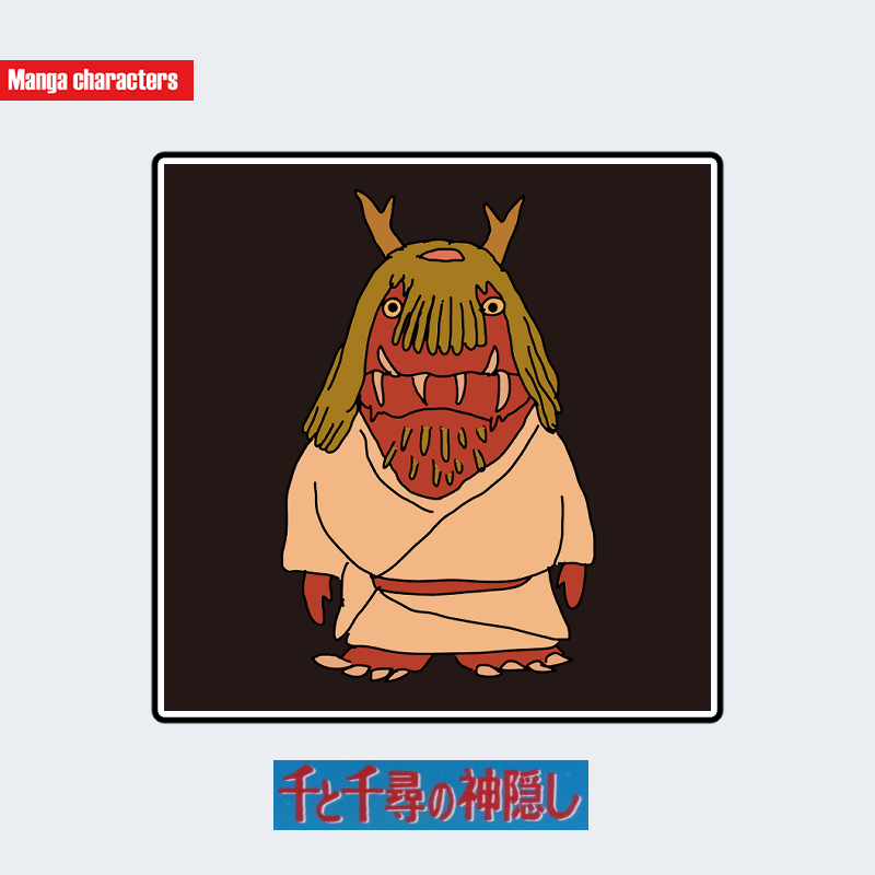 『千と千尋の神隠し』に登場する牛鬼は、赤茶系の肌色に大きな上下牙を備えた口部、角状の突起を持つ頭部と、草状の長い髪を組み合わせた擬獣化造形が特徴となる。上半身はゆったりした和装風の布衣で覆われ、腰で交差して結ばれた帯が視認できる。脚部は赤みの強い素肌が露出しており、動物的特徴と人型衣服が混在する二層構造を形成する。顔面の広い口部と多数の牙が強い視覚的要素となり、同作品内の単一塊型キャラとは異なる「獣人系」の階層に属する。