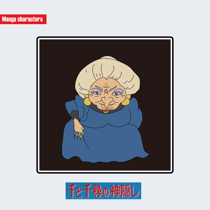 『千と千尋の神隠し』に登場する銭婆は、青色の長いドレス状衣装を基盤とし、肩から裾まで一体化した広がりのあるシルエットを形成している。頭部は大きくまとめ上げられた白髪が特徴で、頭頂部に丸い膨らみを持つ結い髪構造となる。顔面には大きな鼻と強調された眉線、複数の線状皺が配置され、装飾的なイヤリングが付属している。手には指輪が確認でき、宝飾パーツが視覚アクセントとして組み込まれている。同作の他キャラと比べ、人体造形を維持しつつ装飾密度の高い「人物装飾系」の階層に属する。