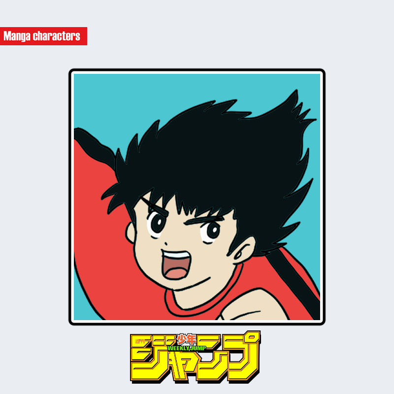 『キャプテン翼』に登場する大空翼は、黒くボリュームのあるショートヘアを持つ擬人化構造のキャラクターである。髪は外側へ広がるギザ状のシルエットとなり、前髪が額に向かって斜めに落ちる構造が特徴的である。上半身は赤色を基調としたスポーツユニフォームで、肩から腕にかけて白いラインが配置されている。顔面は大きめの目と太めの眉で構成され、輪郭線はシンプルな曲線でまとめられている。可視範囲では防具類は確認されず、ユニフォームと髪型が視覚デザインの中心となっている。