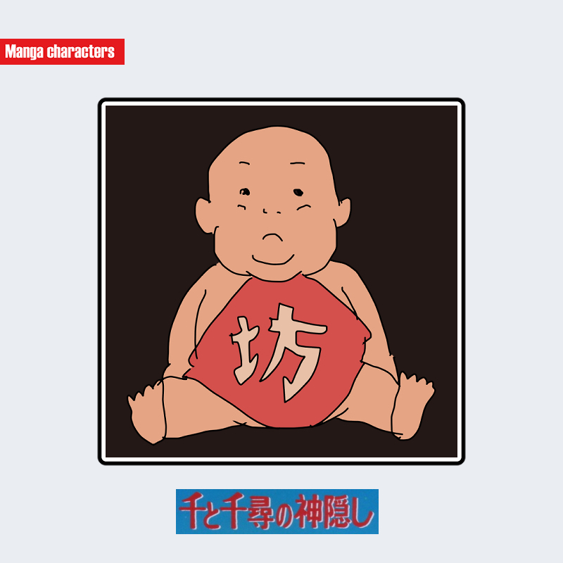 『千と千尋の神隠し』に登場する坊は、体全体が丸みを帯びた乳児的体格を基盤とし、頭部から四肢まで一体的に太いシルエットで構成されている。衣装は赤い腹掛け一枚で、中央に大きく文字が描かれた「単一布パーツ」構造が特徴となる。腕と脚は肉厚で短く、関節表現は最小限に抑えられ、身体の量感が前面に強調されている。頭部は丸く髪の毛はなく、眉・目・口が記号的に配置される。他キャラの人型布衣系(湯婆婆・千尋ら)とは異なり、衣服要素が極端に少ない「乳児型シルエット」の視覚階層に属する。