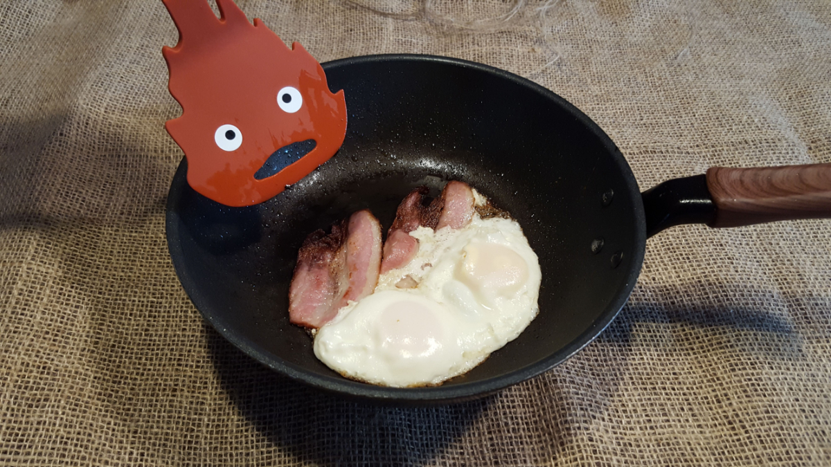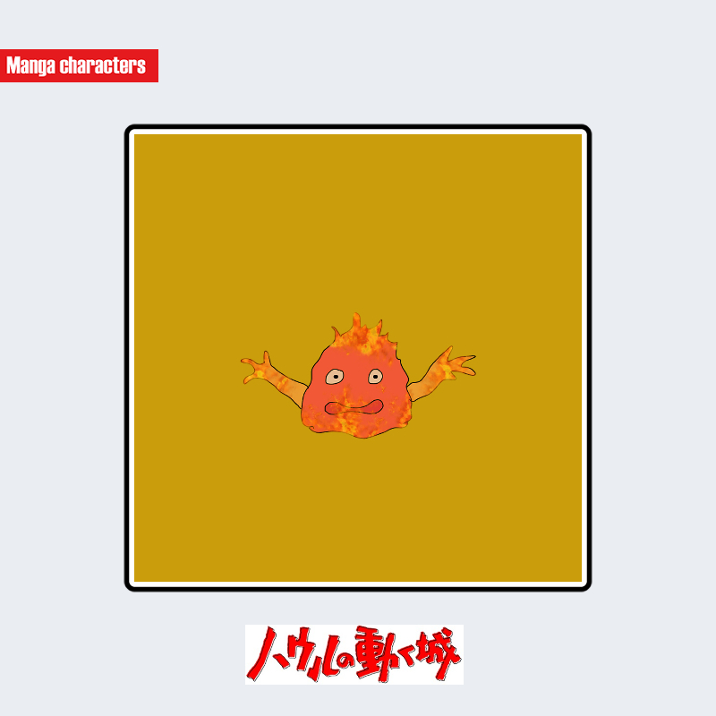 『ハウルの動く城』に登場するカルシファーは、赤みを帯びた炎状のシルエットを主体とした流動的な外形が特徴である。画像では、中心部が濃色、外縁が黄色寄りのグラデーションで描かれ、炎の揺らぎを簡略化した造形が確認できる。顔は白い円形の目と横長の口という単純化された記号表現で構成されている。腕は炎の延長線上にある突起的パーツとして描かれ、身体の境界が固定形状ではない「流動体構造」となっている。同作の人物キャラ(ハウル、ソフィー)と比べ、固体的輪郭を持たない造形が際立つ。