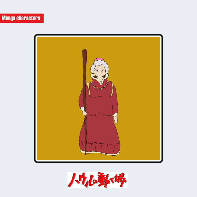『ハウルの動く城』に登場するサリマンは、白髪を後方にまとめた髪型と、首元から肩周りにかけて円形の装飾を施した赤系ローブが特徴である。衣装は裾広がりの一体型構造で、腰部に切り返しのない連続的なシルエットとなっている。手には長い杖を保持しており、縦方向の視覚軸を強調する要素として機能している。ローブの装飾は、同作の人物キャラ(ソフィーやハウル)のより動的な衣装線とは異なり、儀礼的・安定的な形状で構成されている。全体として「儀礼衣装型」の構造分類に該当する。