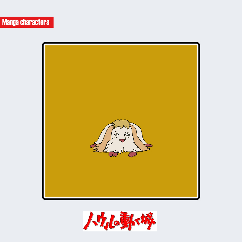 『ハウルの動く城』に登場するヒンは、低い体高と丸みのある胴体を持つ四足形のキャラクターである。頭部には長く垂れ下がる耳が左右に配され、毛並みは淡いクリーム色を基調としている。顔は小さな目と短い鼻先で記号的にまとめられ、前足は短く、肉球部分が強調される形で描かれている。全体のシルエットは「小型擬獣化構造」に該当し、同作の人物キャラとは異なる、柔らかく低重心の造形バランスが特徴である。