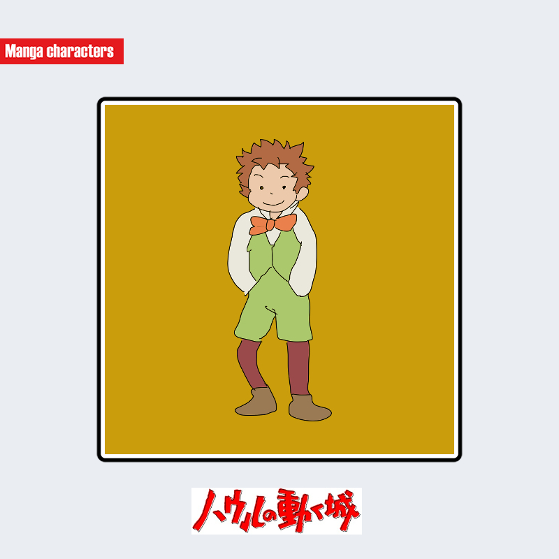 『ハウルの動く城』に登場するマルクルは、外側へ広がる短めの髪型と、淡い緑系の上下衣装を組み合わせた軽快なシルエットが特徴である。上半身は白い袖を持つシャツの上に緑のベストを重ね、胸元には大きめの赤いリボン状の装飾が配置されている。下半身は濃赤色のパンツと茶系のブーツで構成され、明瞭な色分割が視覚的区分を形成している。衣装全体は「分割色彩型」の構造に該当し、同作のハウルやソフィーの柔らかい衣装線よりも、直線的で簡潔な輪郭が強調されている。