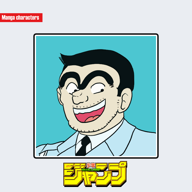 『こちら葛飾区亀有公園前派出所』に登場する両津勘吉は、太く弧を描く眉と角ばった輪郭線が特徴的な擬人化構造のキャラクターである。髪型は短髪で濃い黒色、前髪は直線的に切りそろえられている。口元は大きく開いた笑顔が描かれ、顎には短いひげ状の陰影がつけられている。上半身は水色の制服風スーツで、白いシャツと黒のネクタイが内側に確認できる。肩のラインや襟の構造は直線的で、衣服のシルエットは厚みよりも輪郭の強調が中心となっている。