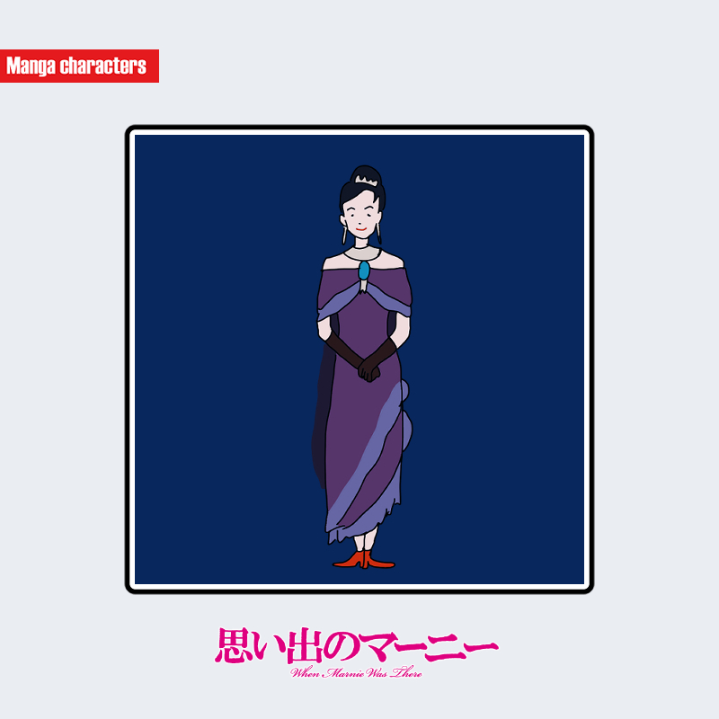 『思い出のマーニー』に登場するマーニーの母は、髪を高くまとめたアップスタイルが特徴で、頭頂部に高さを出した整ったシルエットになっている。衣装は紫系の色調を基調としたロングドレスで、肩周りには斜めにクロスした布が重なり、胸元には大きめの青い宝石風装飾が配置されている。袖はなく、腕には濃色の長手袋が組み合わされ、足元まで布の流れが階段状に変化する構造が見られる。全体として「フォーマルドレス型」に分類され、他キャラと比較して装飾密度が高い衣装デザインとなっている。