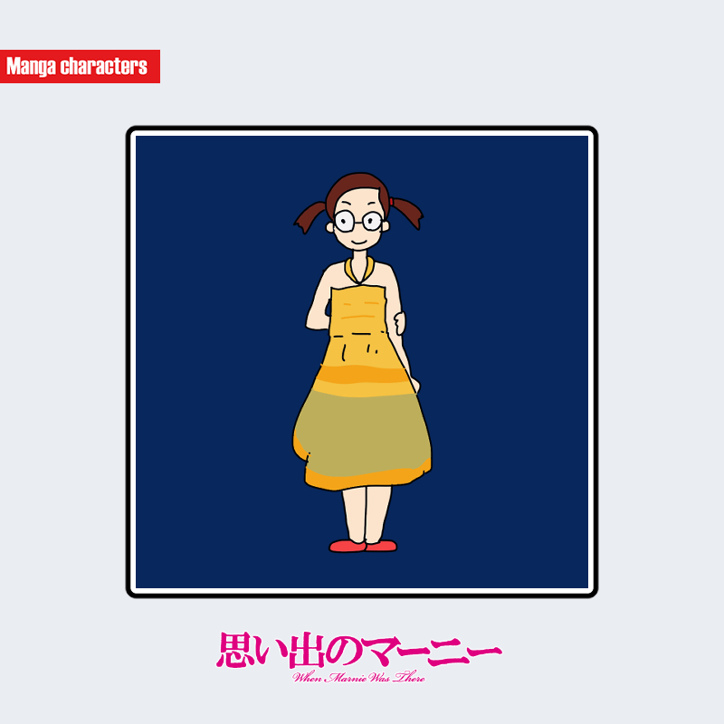 『思い出のマーニー』に登場する彩香は、左右に結んだ赤茶系のツインテールが特徴的で、前髪は額に沿って整えられている。丸い眼鏡を着用しており、小ぶりなフレームが顔立ちの識別要素となっている。衣装は肩紐つきの黄色系ワンピースで、上部が淡色、裾に向かって濃色へ変化する段階的な配色が施されている。スカート部分は丸みのあるシルエットで、足元は赤い履物が組み合わされている。構造分類としては「日常衣装型」に該当し、色彩分布の明確さが目立つ。