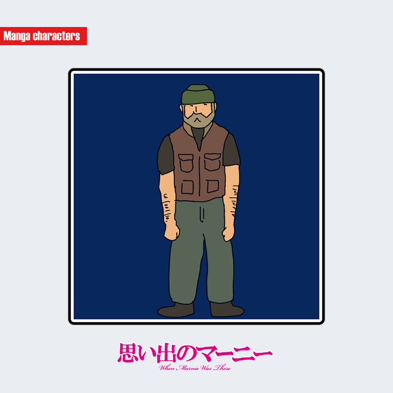 『思い出のマーニー』に登場する十一(といち)は、無精ひげと短く刈り込まれた髪型が特徴の中年男性である。上半身は袖なしベストを着用し、前面に複数のポケットが配置された機能的な構造になっている。腕には細かな線状の模様(視覚的にはタトゥー風のマーク)が描かれており、肌の露出部分が多い点が特徴的である。下半身はカーキ系のワイドパンツで、足元まで直線的なシルエットを保っている。構造分類としては「作業衣装型」に該当し、同作のキャラクターの中でも実用性を重視した衣装構成となっている。