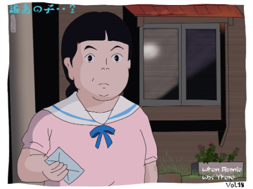 「信子」は日本で一般的な名前のため、ピンクのトップス・青いリボン・濃紫のハーフパンツという視覚要素を併記することで、本作の信子としての識別が容易になる。