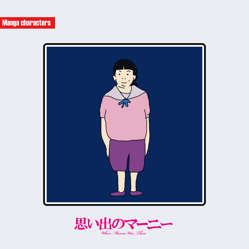 『思い出のマーニー』に登場する信子は、短めの黒髪を整えたシンプルな髪型をしており、前髪は額に沿ってまっすぐ下ろされている。衣装は淡いピンク系の半袖トップスで、襟元には青いリボン状の装飾が付いている。下半身は濃紫系のハーフパンツで構成され、全体は軽装寄りのシルエットとなっている。袖やパンツの形状は直線的で、構造分類としては「日常衣装型」に該当する。同作キャラの中でも色のコントラストが強く、識別性が高い点が特徴である。