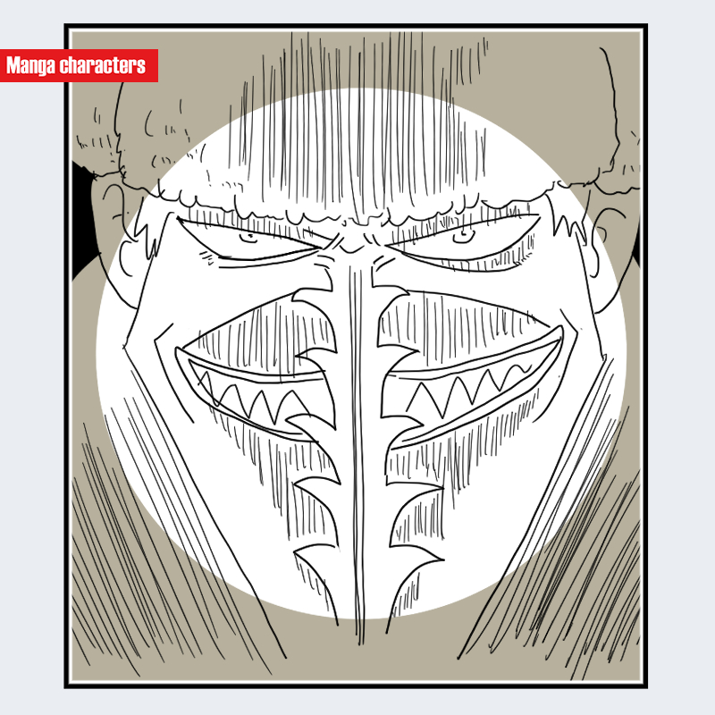 『ONE PIECE』に登場するアーロンは、顔面中央に縦方向へ大きく張り出した鼻部構造を持ち、全体が鋭利な曲線で構成された「擬獣化構造」のシルエットが特徴である。鼻から口元にかけてのラインは湾曲しつつ尖り、サメを想起させる形状が強調されている。眉は太く斜めに走り、眼窩の影が深いため、目の周囲が強く締まった輪郭を形成する。頬から顎にかけては直線よりも鋭い曲線が優勢で、他キャラと比べても顔の中央軸が極端に突出している点が識別点となる。