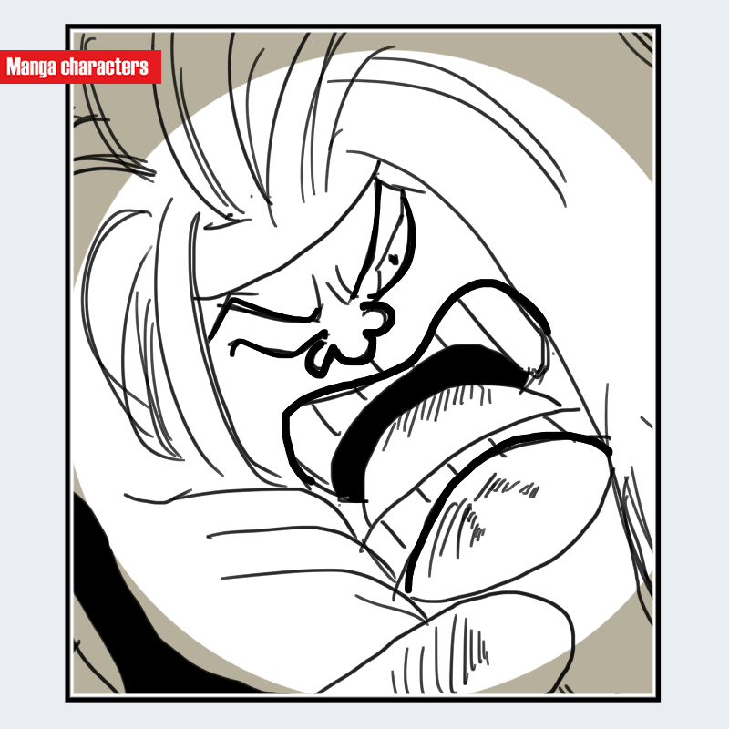 『ONE PIECE』に登場するクマドリは、額から頬にかけて濃く太い縦線が走る特徴的なフェイスペイントと、極端に湾曲した口元が強調された「歌舞伎様式構造」の造形を持つ。眉は大きく吊り上がり、目の上下に強い陰影が入るため、顔面の中央軸が縦方向に引き伸ばされたシルエットとなっている。髪は前方向へ張り出す形で描かれ、額の縦線と連続するように上方向へ流れる。口は横長に開き、上唇・下唇とも厚く、曲線が顔の鋭い線構造と対照を成している。同作品内でも、歌舞伎的な線構成が最も強いキャラクターの一人として識別しやすい。