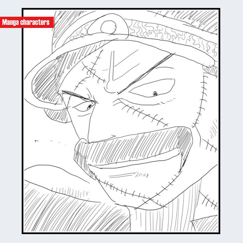 『ONE PIECE』に登場するゲンゾウは、顔全体に複数の縫い目状ラインが走る「縫合意匠構造」を持ち、額から頬にかけて斜めに走る大きな縫合線が最も目立つ視覚要素となっている。眉は太く短く、目周りの影が強調されており、縫合線と組み合わさって独特の輪郭を形成している。口元には厚みのある髭が広がり、下顎の輪郭と重なるように描かれている。髪は短く後方へ流れる線が入り、顔の縦方向の縫合線と対比する構造になっている。同作品内でも、縫い目状の線をこれほど広範囲に持つキャラは少なく、識別が容易である。