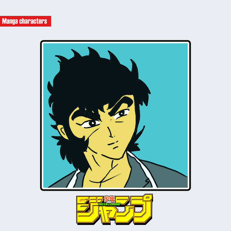 『ドーベルマン刑事』に登場する加納錠治(かのう じょうじ)は、黒髪の逆立つようなシルエットと鋭い眼差しを特徴とする擬人化構造のキャラクターである。髪は後方へ向かって大きく広がる外向きの毛束で構成され、前髪は短く尖ったラインが額にかかる形状となっている。目は切れ長で、太く角度のある眉が表情の中心に据えられている。上半身は開襟シャツとジャケットの組み合わせで、襟元の鋭角的なラインが全体の造形と調和している。輪郭線は直線と鋭角を多用し、硬質な印象を生むデザイン構造となっている。
