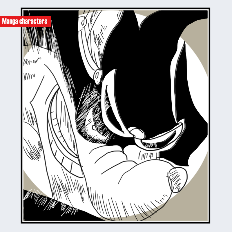 『ONE PIECE』に登場するジャブラは、口元を大きく裂くような造形と、牙状に尖った歯列が前方へ張り出す「擬獣化構造」を持つキャラクターである。鼻から上唇にかけては厚い線で区切られ、狼を思わせる口元の湾曲が強調されている。目は細く鋭い形状で、まぶたの影が強く入ることで獣的な輪郭を形成する。頬や顎まわりの描線は粗く、顔の下半分に濃い陰影が集まっている点が特徴である。同作品内では動物要素が顔面構造に直接反映される希少なタイプで、口元の形状が最大の識別要素となる。