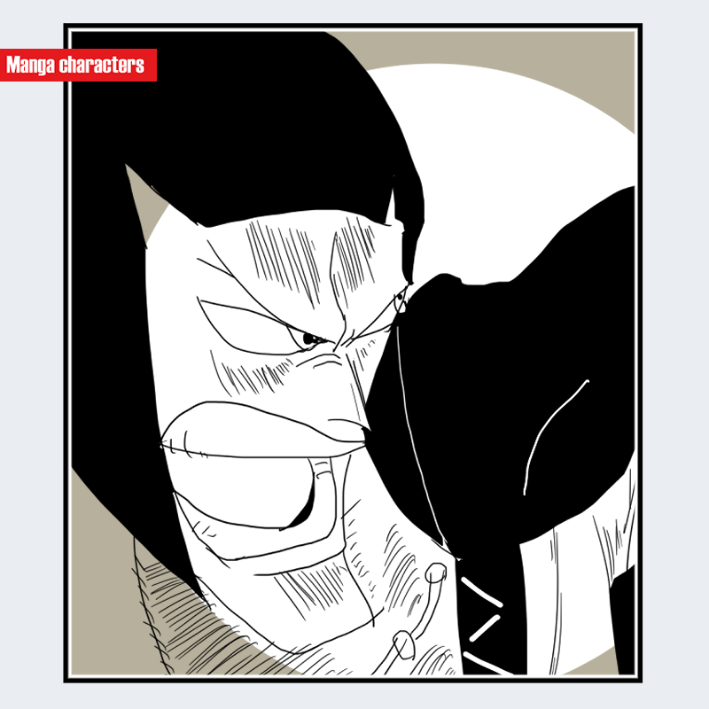 『ONE PIECE』に登場するチャカは、縦方向に長い顔面シルエットと、鼻梁から口元にかけて強く下向きにカーブする「擬獣化構造」の特徴を持つ。目は細く鋭く描かれ、上まぶたの黒い影が強調されており、視覚的重心が上方に寄っている。頬から顎にかけては硬い直線が主体で、動物的な口元の張り出しと対照的に緊張感のある輪郭が形成される。髪は前方へ流れる束が額を覆うように落ち、顔の縦軸をさらに強調する。擬獣化構造の中でも、特に口元の前方突出と細い眼が組み合わさったタイプは本キャラ特有の識別要素である。