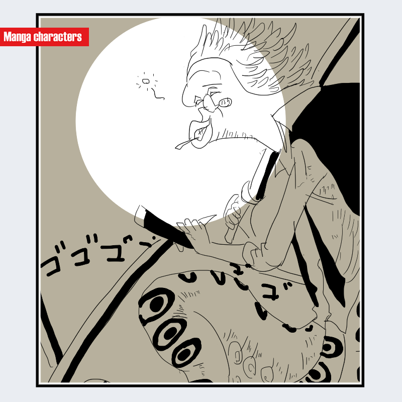 『ONE PIECE』に登場するヒョウゾウは、長く尖った鼻と、顔面中央を斜めに走る大きな輪郭線が特徴的な「擬獣化構造」を持つキャラクターである。髪は強い上方向の動きを持つトゲ状のシルエットで、頭頂から後方へ放射状に広がっている。目は細く、眼鏡の丸いフレームがそのまま視覚的アクセントとして機能し、鼻の曲線と対比する円形要素を形成する。口元は前方へ伸びる形で描かれ、顎の細長いシルエットを強調している。肩から腕にかけては細身の輪郭で、全体として縦方向へ伸びるラインが支配的である。