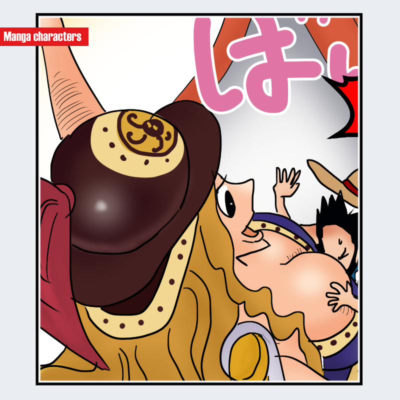 『ONE PIECE』に登場するアフェランドラは、非常に大柄な体格と、頭部を大きく覆う円形の帽子が特徴の「巨体装飾融合型」シルエットを持つキャラクターである。帽子は丸みを帯びた広いフォルムで、上部には装飾的な紋様が描かれており、頭部外郭の中心視覚要素となっている。髪は長く背面へ流れ、太い束感を持って肩から下へ広がる構造である。上半身は露出の多い衣装構成で、肩から胸元にかけて大きな面積を占め、身体の大きさが強調される。巨体キャラでありながら、頭部装飾による上方向の視覚重心が特徴的で、同作品内でも識別が容易な外観となっている。