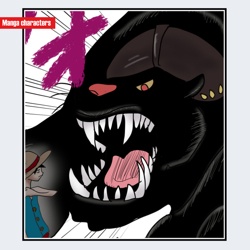 『ONE PIECE』に登場するバキュラは、全身を覆う漆黒の体毛と、極端に発達した牙が突出する「擬獣化構造」を持つキャラクターである。口腔は大きく開き、上下の牙が鋭角に前方へせり出し、口内のピンク色の肉質が強いコントラストで描かれている。眼は小さく赤みを帯び、黒い毛並みとの対比で視覚的な攻撃性を強調している。顔や体の輪郭は曲線を主体にしつつも、牙まわりだけは硬い直線的描線が用いられているため、口部がシルエットの中心的要素となっている。周囲に小型のキャラが描かれていることで、バキュラ自体の体躯の大きさが強調されている。