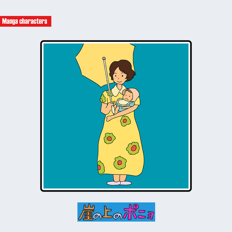 『崖の上のポニョ』に登場する婦人は、肩にかかる長さの落ち着いた茶色の髪と、黄色い花柄ワンピースが特徴である。ワンピースは肩部分に少し膨らみをもたせた袖を持ち、胴部から裾まで一体で広がる「一体型ワンピース構造」に分類される。手には赤ん坊を抱えており、視認上の主要パーツとして腕と上半身の動線が強調されている。さらに、頭上には淡黄色の傘を差しており、衣装全体の色調とリンクする視覚的アクセントを形成している。装飾は柄の反復が中心で、他キャラ(リサやヨシエ)の単色衣装と比較すると、模様の存在が際立つ。