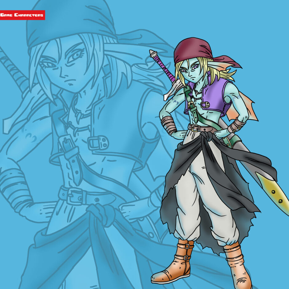 『ドラゴンクエストX(2012)』に登場するヒューザは、短髪を後ろに流した青色系の髪を持ち、長いバンダナ状の布を頭部に巻いている。上半身は襟元を大きく開けた軽装のジャケットを着用し、腰回りにはベルトや帯を複数重ねて装飾的に固定している。下半身は動きやすいズボンとブーツを合わせ、全体として冒険者風の実用的構造にまとまっている。耳飾りや首飾りなど細かなアクセサリーも見られ、装備全体は「遊撃型衣装構造」に分類できる。同作における他キャラと比較すると、鎧や儀礼服を基調とする者とは対照的に、実戦性と機動性を重視したデザインが際立つ。