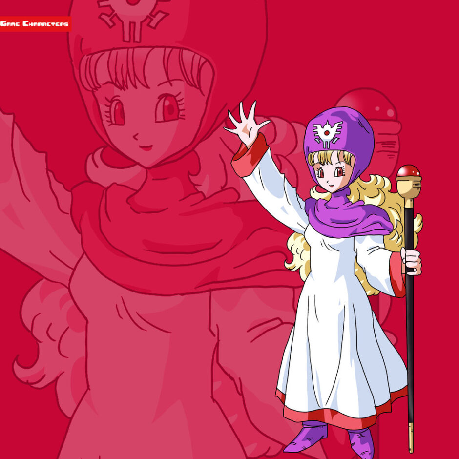 『ドラゴンクエストII 悪霊の神々(1987)』に登場するプリンは、金色の長髪を大きくカールさせて背面に広げ、紫色のフード型帽子を頭にかぶっている。帽子の中央には白の紋章が描かれ、視覚的な識別要素となっている。衣装は白を基調としたローブで、袖口や裾には赤い縁取りが施され、首元には紫のマフラー状の布を巻いている。右手には赤い球状装飾が付いた長い杖を持ち、全体的に「儀礼衣装型」として整理できる。同作の勇者やトンヌラが鎧や盾を主体とするのに対し、プリンは布装備と象徴的装飾を基調とする点で対比的である。