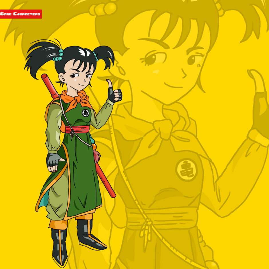 『ドラゴンクエストIII そして伝説へ…(1988)』に登場する武道家(女)は、黒髪を二つに結い上げ、左右に大きく跳ね上がった髪型が特徴的である。頭部には水色の飾り玉を用いた髪留めを付け、首元には橙色のスカーフを巻いている。衣装は緑を基調とした武道着で、胸部に円形の紋章を縫い付け、腰には赤い帯を巻いている。右手には棒術用の武器を背負い、手には指ぬき手袋を着用。全体像は「武道装束型」に分類でき、男の武道家が露出度と体格を強調する構造に対し、女武道家は軽装ながらも布の重ねや帯装飾によって動きやすさと象徴性を両立させている。