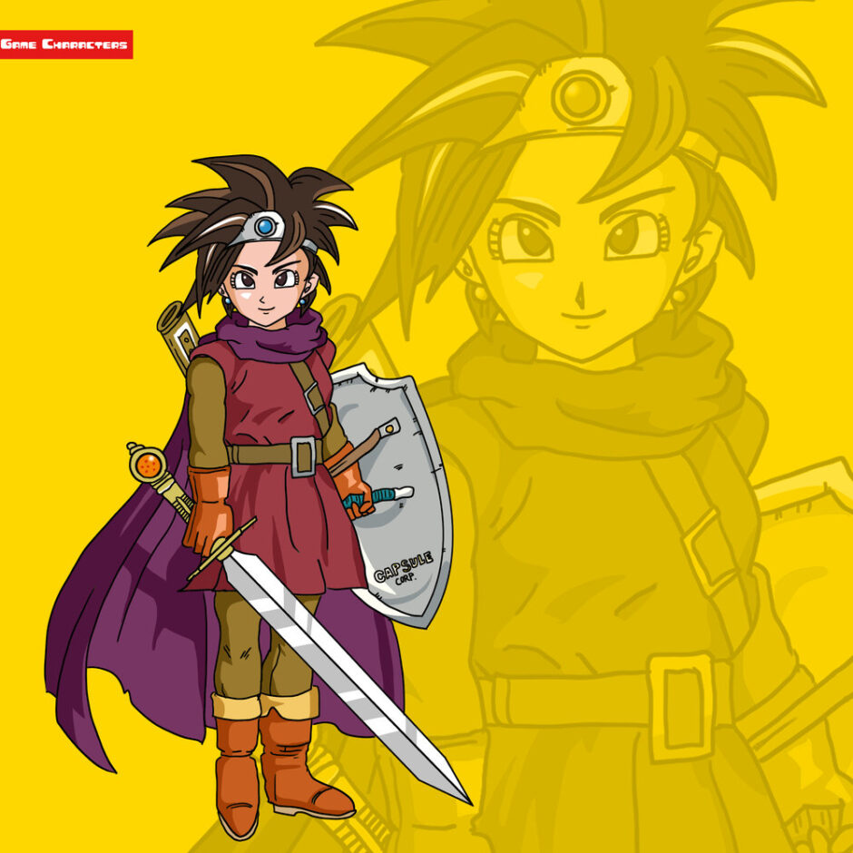『ドラゴンクエストIII そして伝説へ…(1988)』に登場する勇者(女)は、額に青い宝玉をあしらった銀色のサークレットを装着し、茶色系の衣装に赤紫のマントを羽織っている。髪は逆立つように大きく広がるショートスタイルで、動きを強調するシルエットとなっている。胸部から腰にかけてはベルトで固定され、肩から下はチュニック状に広がる布構造を採用。脚部はブーツを装備し、手には直線的な長剣を、もう一方の腕には銀色の盾を携える。全体像は「冒険者標準型」に分類でき、他職業の重装備や儀礼的衣装に比べ、実用性と象徴性の双方を兼ね備えた造形となっている。