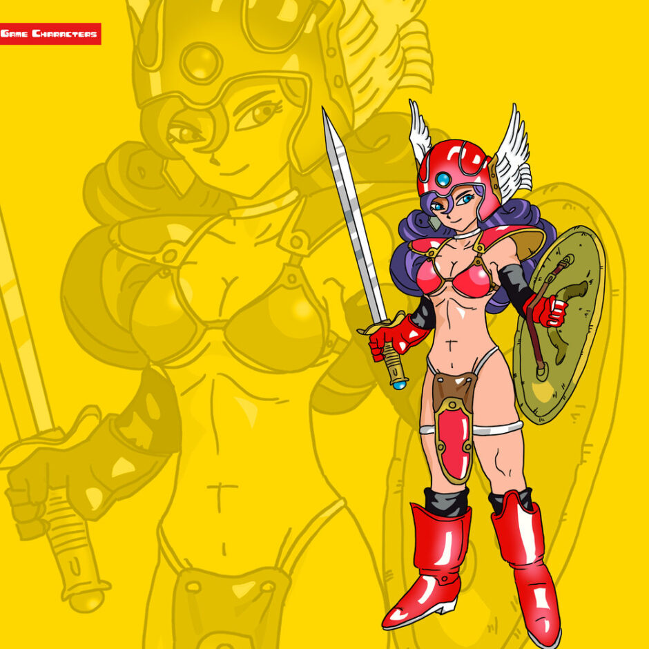 『ドラゴンクエストIII そして伝説へ…(1988)』に登場する戦士(女)は、赤色を基調とした鎧を身に着け、頭部には白い翼飾りが付いた兜を装着している。胸部は金属プレートで覆い、肩から腰にかけては最小限の防具を組み合わせた軽装鎧型である。左手には円形の盾、右手には直線的な長剣を携えている。腕部は赤い籠手、脚部には防具を伴うが全体的に露出度が高く、戦闘職でありながら装飾性を前面に押し出している。「装飾軽鎧型」として分類でき、同作の男戦士の重厚な防具構成と対比すると、デザイン性を強調した特徴が見られる。