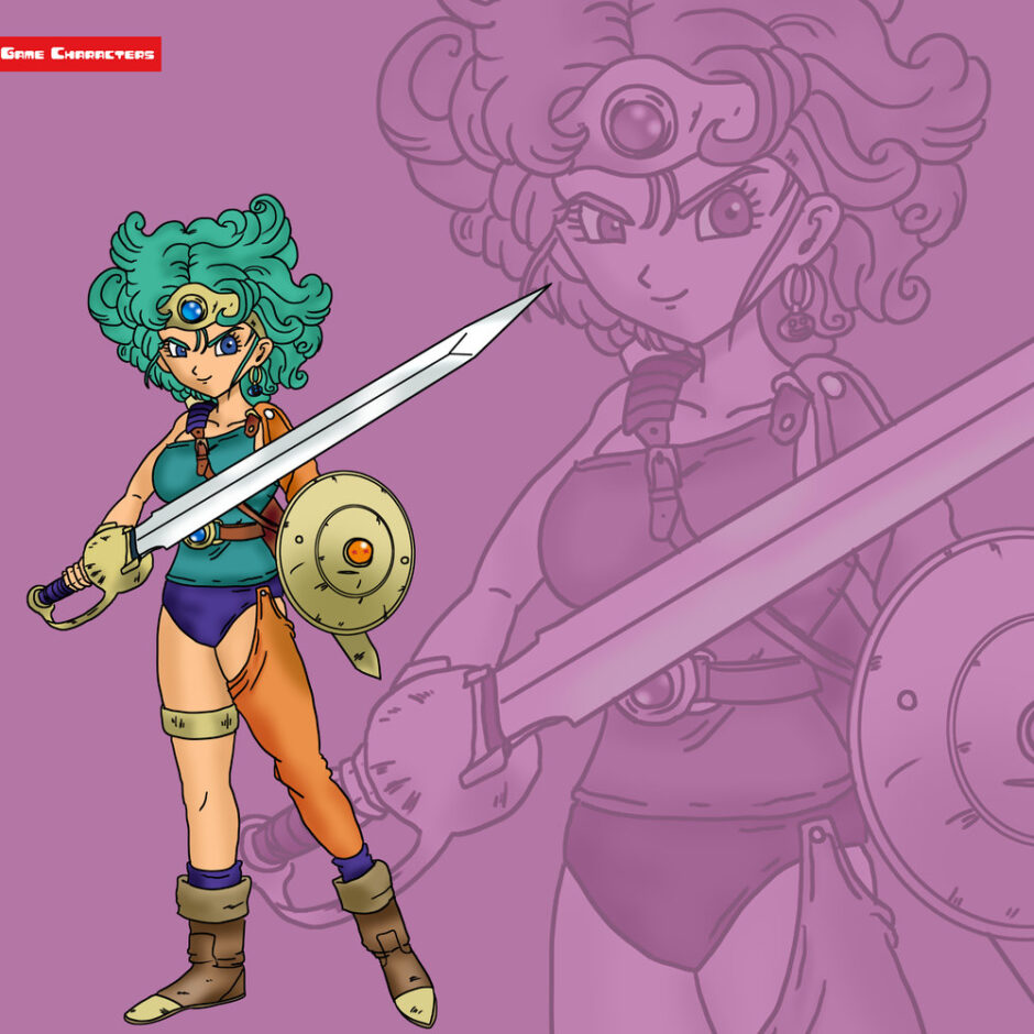 『ドラゴンクエストIV 導かれし者たち(1990)』に登場する勇者(女)は、鮮やかな緑髪を大きくカールさせ、額には青い宝玉をあしらったサークレットを装着している。衣装は濃緑のチュニックを基調とし、肩からは革製の防具を備え、腰にはベルトを巻いて装備を固定。片足には橙色のブーツとスパッツを組み合わせ、もう片方は露出しており、非対称的なデザインが特徴的である。右手には直線的な長剣を、左手には小型の円盾を携え、全体的に「冒険者標準型」に分類できる。男勇者の落ち着いた配色に対し、女勇者は彩度の高い髪色と衣装で差別化されている。