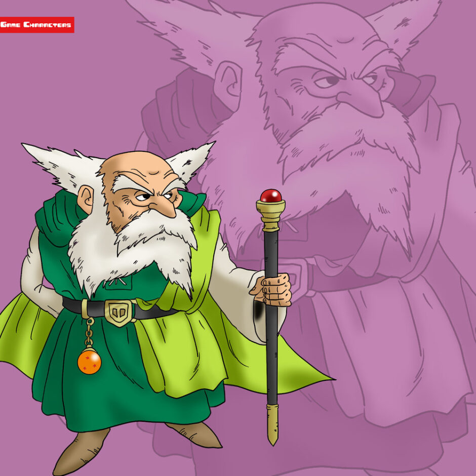 『ドラゴンクエストIV 導かれし者たち(1990)』に登場するブライは、長い白髭と白い眉を特徴とする高齢の魔法使いである。頭頂部は禿げ上がり、側頭部から後方にかけて髪が残り、耳の高さから外側に大きく跳ね上がる髪型をしている。衣装は深緑のローブを基調に、肩から明るい黄緑のマントを羽織り、腰には黒いベルトを締めて橙色の宝玉飾りを吊るしている。手には赤い宝玉を先端にあしらった杖を持ち、全体の装束は「儀礼魔導型」に分類できる。同作におけるクリフトや僧侶系の布装備と比較すると、ブライはより魔術的記号を強調した造形が目立つ。