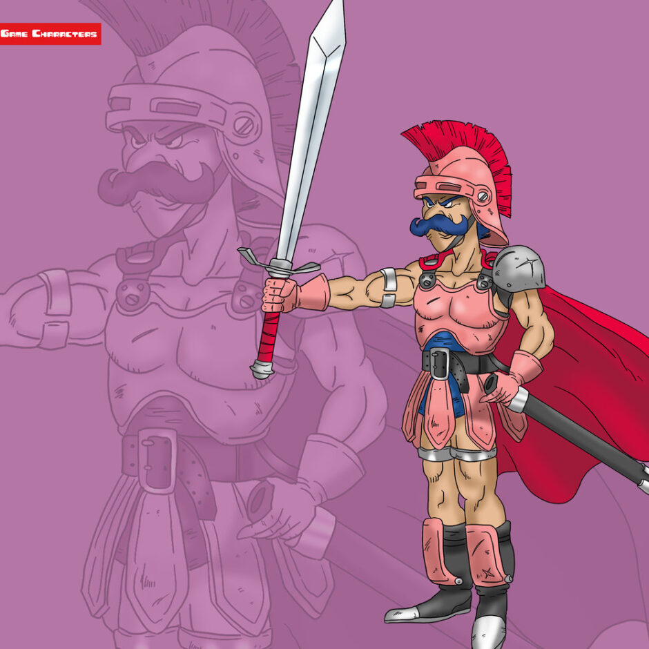 『ドラゴンクエストIV 導かれし者たち(1990)』に登場するライアンは、赤い羽飾り付きの兜をかぶり、濃い青色の口ひげを蓄えた壮年の戦士である。衣装は赤を基調とした金属鎧で、胸部や腰部に金属プレートを装備し、肩には片側のみのアーマーを装着している。腰には青いベルトを締め、背中には赤いマントを羽織り、手には大型の長剣と槍を携える。脚部は防具を組み込んだブーツで覆われ、全体は「重装戦闘型」に分類できる。同作の僧侶や魔法職と比較すると、ライアンは防御と威容を重視した典型的な戦士構造を持っている。