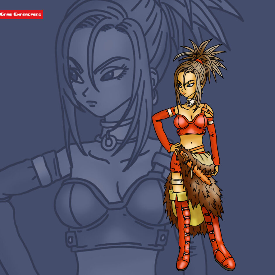 『ドラゴンクエストVIII 空と海と大地と呪われし姫君(2004)』に登場するゲルダは、赤茶色の髪を高く逆立てたポニーテールにまとめた髪型が特徴的である。衣装は赤を基調とした露出度の高いブラトップとアームカバーを身に着け、腰には毛皮を取り入れた布を巻き付けている。脚部は赤いパンツに革のベルトや装飾を施し、戦闘性を意識した構造を持つ。首元にはチョーカーを着け、全体的に荒野を生き抜く盗賊的な意匠が際立つ。全体像は「軽装戦闘型」に分類でき、同作のゼシカが魔導的・妖艶な意匠を持つのに対し、ゲルダは野性的で実用的なデザインとなっている。