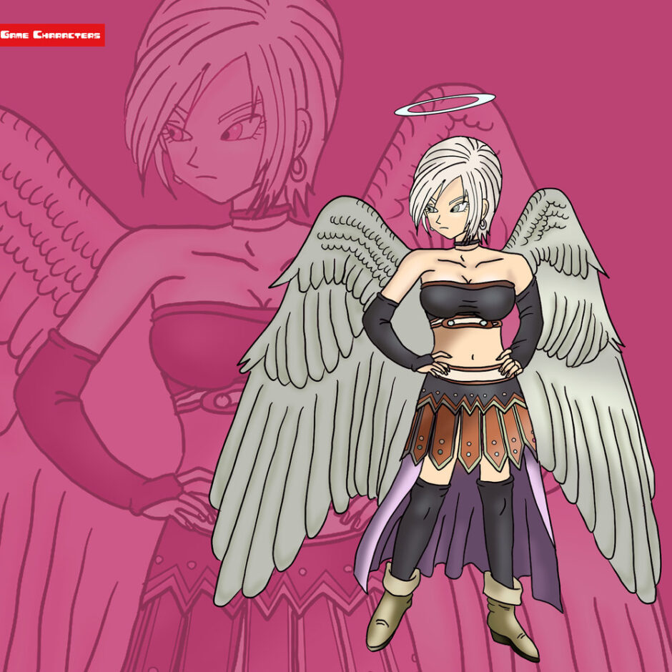 『ドラゴンクエストIX 星空の守り人(2009)』に登場するラヴィエルは、白銀色の短髪を持ち、頭上に光輪を浮かべた女性キャラクターである。背中には大きな白い翼が広がり、天使的な存在であることが強調されている。衣装は黒のチューブトップとアームカバーを基調に、腰部には装飾的な金属意匠を施したスカート状の防具を装備。足元は黒のロングブーツと紫の布を組み合わせ、全体的に軽装ながらも威厳を備えた姿となっている。全体像は「天使戦士型」に分類でき、同作のイザヤールが男性的で重厚なデザインを持つのに対し、ラヴィエルは露出度が高く、戦闘性と象徴性を融合させた構造を特徴としている。