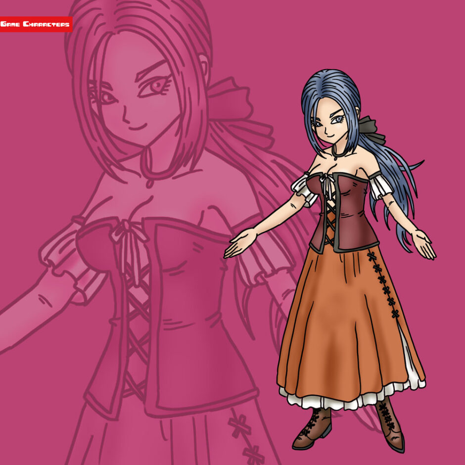 『ドラゴンクエストIX 星空の守り人(2009)』に登場するルイーダは、青みがかった長髪を後ろで束ね、前髪を流したスタイルが特徴的な女性キャラクターである。衣装は赤茶色のコルセット風トップスにオフショルダーの白い袖を合わせ、胸元にはリボン状の編み込み装飾が施されている。スカートは茶系統のロング丈で、側面に黒い花模様の装飾が入り、全体として「酒場女主人型」の構造を持つ。デザインは艶やかさと落ち着きを兼ね備え、同作の素朴な衣装を纏うキャラクター(例:リッカ)と比較すると、成熟した雰囲気を強調している。