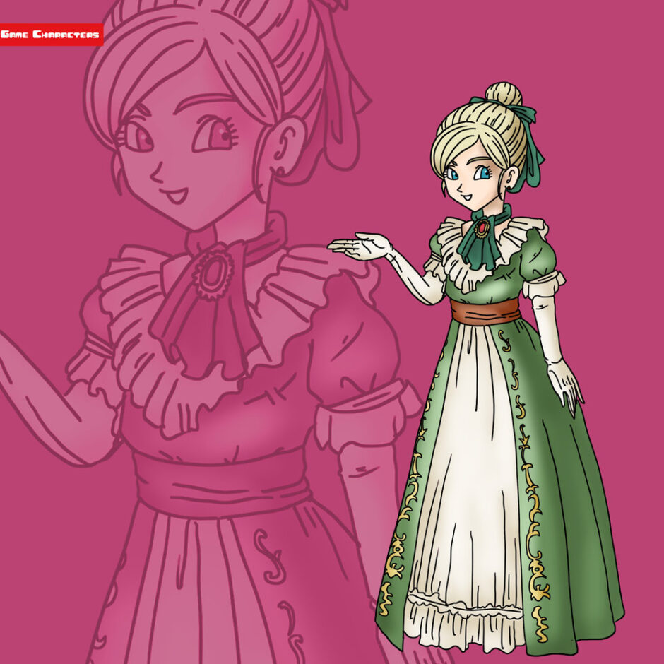 『ドラゴンクエストIX 星空の守り人(2009)』に登場するロクサーヌは、ブロンドの髪をまとめ上げ、後頭部に大きなリボンを結った端正なヘアスタイルが特徴である。衣装はクラシカルなメイドドレス風の構成で、緑のロングドレスに白い前掛けを重ね、金糸の縁取り模様が施されている。袖は七分丈で、胸元にはフリルと大きなリボン飾りがあり、全体的に「メイド女主人型」の構造分類に属する。リッカやルイーダと同じく接客・管理を象徴するデザインだが、ロクサーヌはよりフォーマルで気品を強調している。