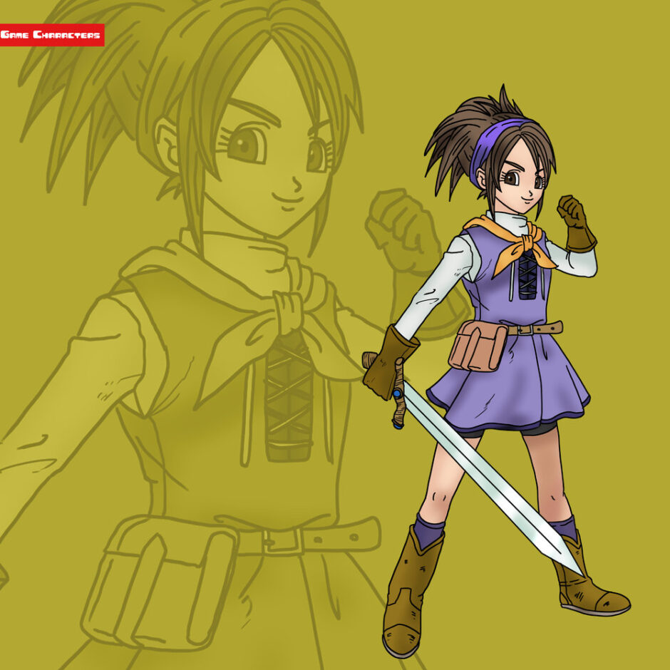 『ドラゴンクエスト チャンピオンズ(2023)』に登場する主人公(女)は、茶色の長髪を高めの位置で束ね、紫色のヘアバンドを装着している。衣装は紫を基調としたチュニック型のワンピースにオレンジのスカーフを首元で結び、腰には小型のポーチを装備。腕には革手袋をはめ、実用性を強調している。脚部はブーツとソックスの構成で、軽快さを重視した冒険者らしい装いを形成している。手には直剣を握り、戦闘的要素が明示されている。構造分類としては「冒険者衣装型/戦闘装備型」に属し、舞台衣装的造形を持つセティアや武闘的装飾を持つゼラムと比較して、よりシンプルで実用的な装いとなる。