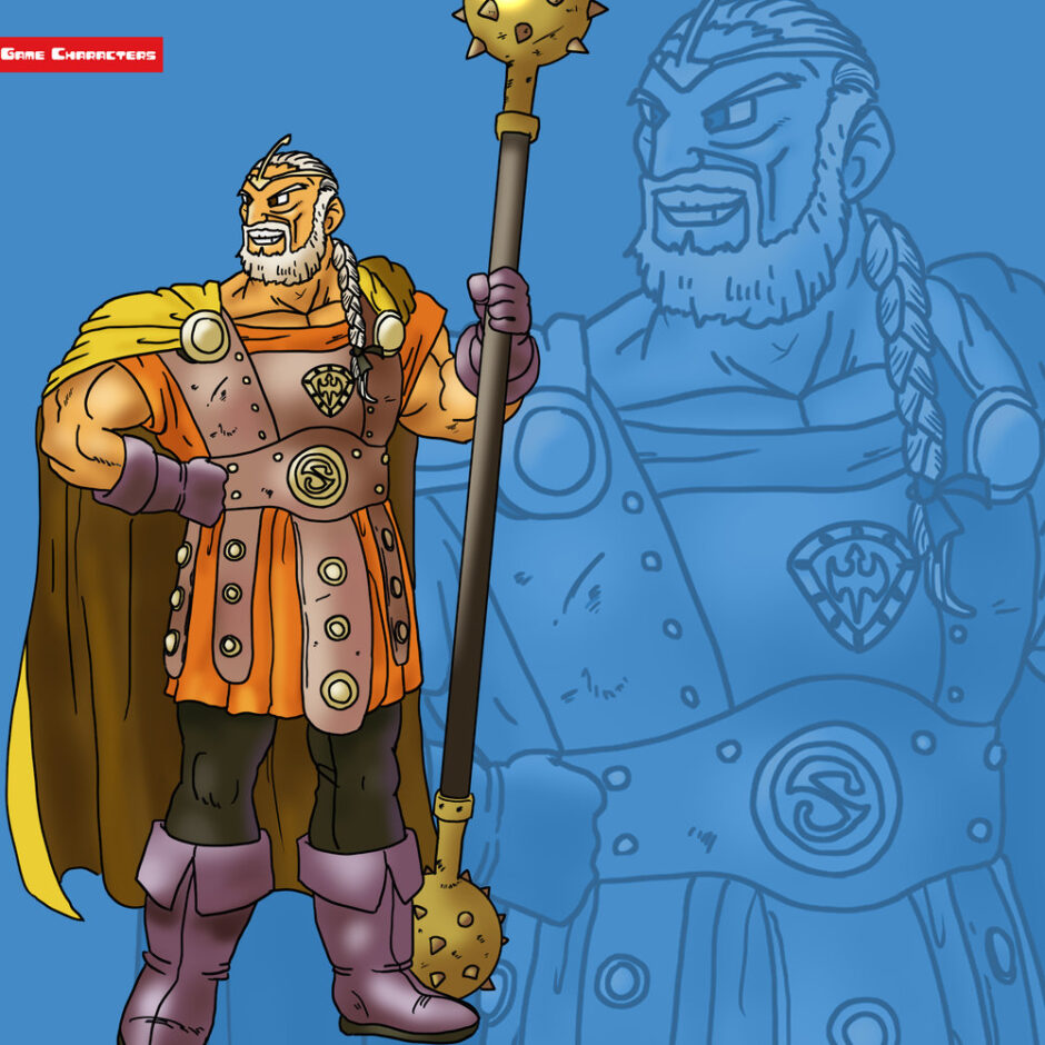 『ドラゴンクエストヒーローズ 闇竜と世界樹の城(2015)』に登場するディルクは、編み込まれた長髪と立派な口髭を備えた屈強な男性として描かれている。衣装は橙色を基調としたチュニックに金属装飾を施した胸当てを組み合わせ、肩からは黄色と茶色の二色マントを羽織っている。腰や胸には円形の金具を多数あしらい、儀礼性と重厚さを強調。下半身は黒のタイツと紫のブーツを履き、装飾性と機能性を両立させた構造。手には棍棒型のメイスを携え、大型の武器を象徴的に扱う姿が特徴的。構造分類としては「戦闘衣装型/重装騎士型」に属し、軽快な装備を持つアクトやメーアとは対照的な重厚感を備える。