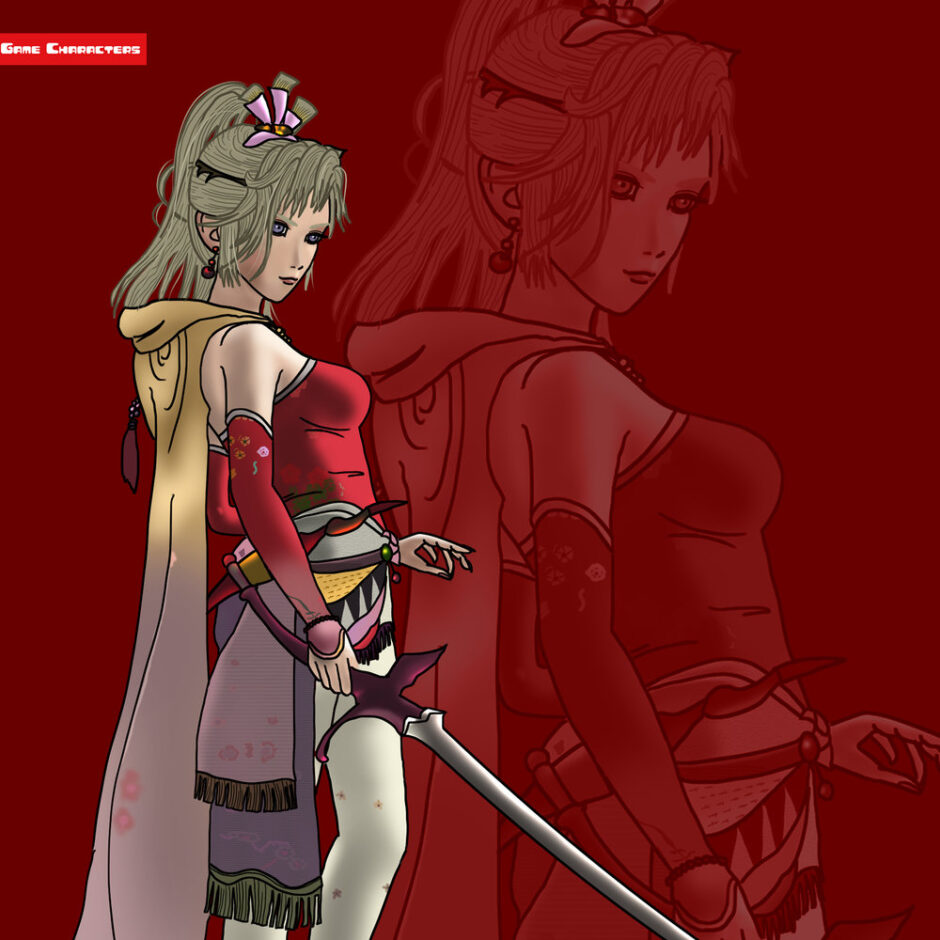 『ファイナルファンタジーVI(1994年)』に登場するティナ・ブランフォードは、緑がかった長髪を後方に束ね、全身を赤系統の衣装で統一している。胸部から腰部にかけてはフィット感のある布地で構成され、袖や裾には金色や模様的な装飾が施されている。脚部はブーツで覆われ、腰回りには布状の装飾パーツが重ねられている。体格は細身であり、衣装の鮮やかな色彩と装飾がシルエット全体を引き立てている。構造分類は「装飾布装型」に属し、同作のロック・コールの実用性重視の軽装構造と対比すると、より華やかで視覚的強調を伴う外観となっている。
