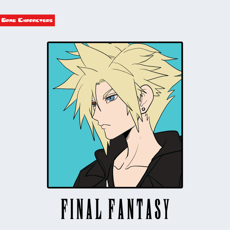 『ファイナルファンタジーVII(1997年)』に登場するクラウド・ストライフは、逆立った金髪を特徴とし、全身を濃紺の衣装でまとめている。上半身は袖なしのタイトなトップスで構成され、左肩には大型の金属製ガードパーツを装着している。腰部にはベルトやホルダーが複数重ねられ、脚部はブーツを基盤とした実用的な装備で覆われている。背には巨大な大剣を担いでおり、全体として細身ながらも武装の重量感が強調されたシルエットを形成する。構造分類は「重装剣士型」に属し、同作のセフィロスの白基調の長衣構造と対比すると、より実戦的で武装特化の外観となっている。