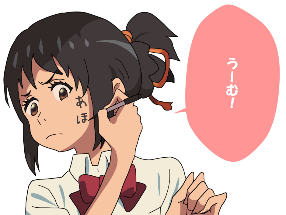 『君の名は。』は英語で Your Name. と表記される。直訳に近いが公式英題であるため、そのまま使用する。作中語(例:組紐、口噛み酒、宮水神社 等)は文化的・宗教的背景に依存する語であり、英文表記時には意味補足が必要である。