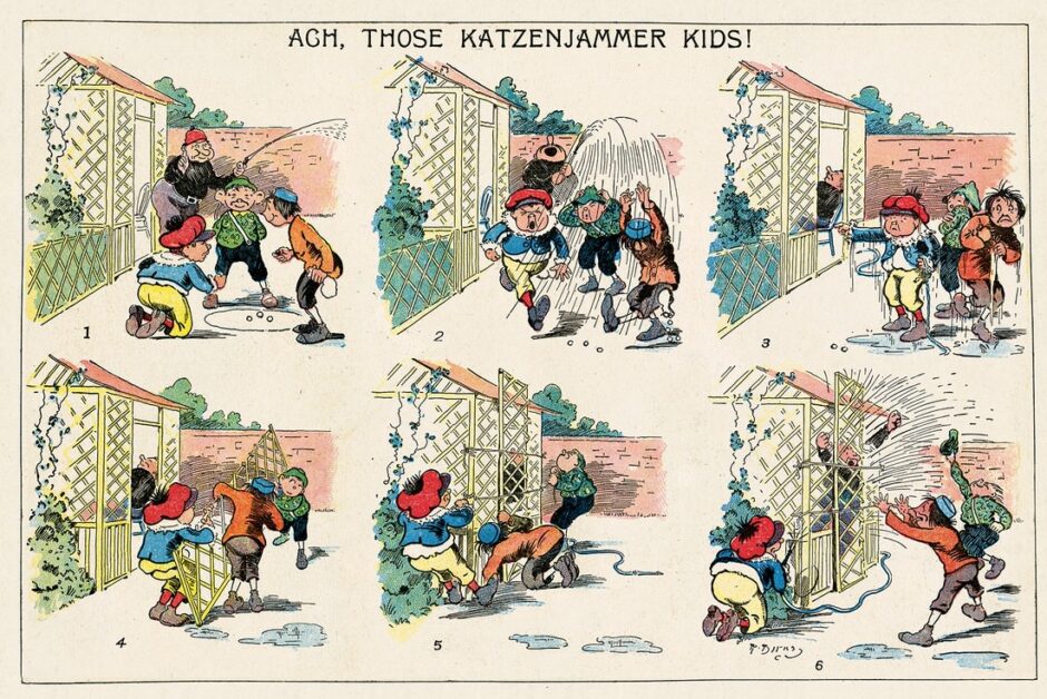 『カッツェンジャマー・キッズ』は、コメディ/スラップスティック系コミックストリップに分類される。作中では双子のハンスとフリッツが主人公であり、彼らの悪戯と騒動が物語構造の核となる。視覚的には19世紀末のアメリカ漫画に特徴的な太線・戯画的表情・簡潔な背景が顕著である。また、台詞の吹き出し表現(スピーチバルーン)の導入に大きな役割を果たし、後続の漫画表現に強い影響を与えた。#作品構造分析 #画風分類整理