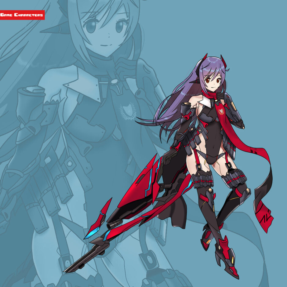 #人工機械融合型 #黒赤基調衣装 #長髪キャラ #角状装飾 #大型武装構造 #機械装飾融合 #直線的デザイン #複合スーツ構造
