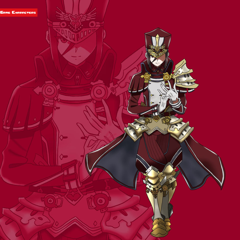 『ゼノブレイド2(2017)』に登場するメレフは、深紅と黒を基調にした軍装風の衣装を纏うキャラクターである。頭部には高い帽子と顔を覆う金属製の飾りを備え、軍服的要素と儀礼的意匠を兼ね備えている。肩から腰にかけては金色の装甲パーツが層状に配置され、下半身にはスカート状の布地と金属防具が複合している。全体として「制服融合型」に分類され、他キャラの装飾防具型デザインに比べて、統制感と儀礼性を強調した構造を持つ。